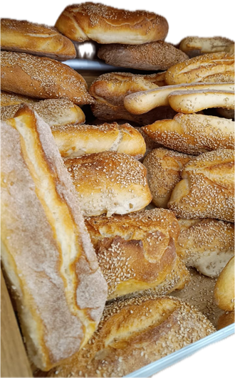 Grano duro: casereccio, toscano. Grano tenero: treccia, corona, torciglione, filone, pane di grano duro ripieno di olive nere. Pane integrale, pane ai 5 cereali. Su ordinazione pane senza lievito.